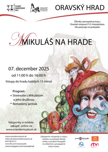 Podujatie „Mikuláš na hrade“ bude prebiehať v priestoroch Oravského hradu 7. decembra 2025. Pre deti sme pripravili zábavný príbeh, v ktorom sa stretnú s Mikulášovou družinou a na záver ich osobne privíta svätý Mikuláš. Na Hlavnom nádvorí bude zároveň prebiehať remeselný jarmok, kde nebudú chýbať medovníky, vianočné oplátky, ručne vyrábané vianočné ozdoby a odznejú známe vianočné koledy, ktoré umocnia tú pravú sviatočnú atmosféru.