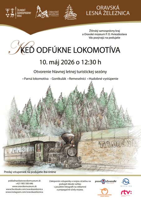 Oravské múzeum P. O. Hviezdoslava Vás pozýva v nedeľu 10. 5. 2026 na otvorenie hlavnej letnej turistickej sezóny na Oravskej lesnej železnici v Oravskej Lesnej. Príďte spolu s nami stráviť príjemné popoludnie v areáli stanice Tanečník počas podujatia „Keď odfúkne lokomotíva“. Čaká na Vás hudobný program a svoje výrobky odprezentujú pozvaní remeselníci. Počas podujatia bude premávať historická parná lokomotíva – GONTKULÁK.